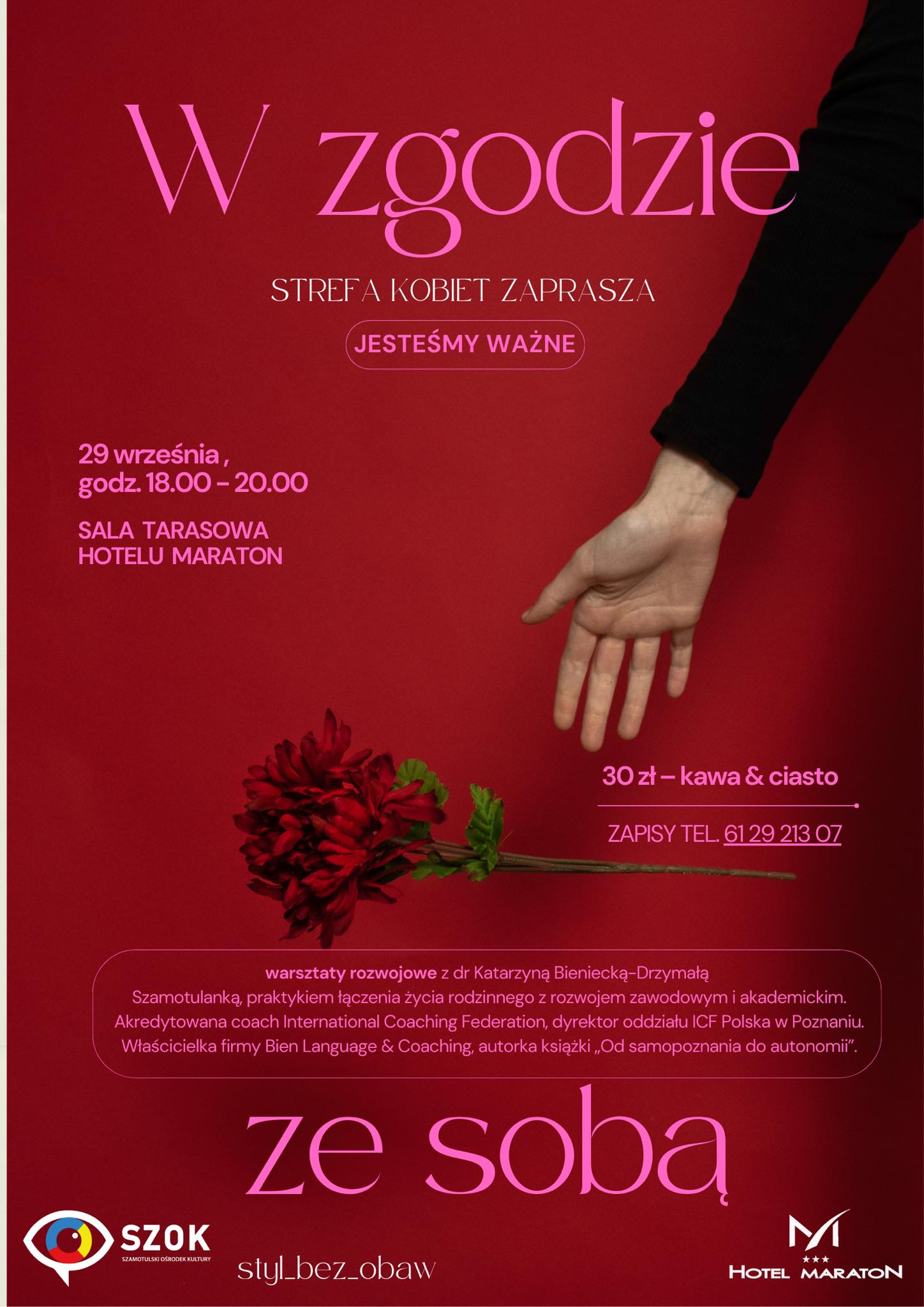Prowadzenie: dr Katarzyna Bieniecka-Drzymała – akredytowana coach International Coaching Federation, dyr. poznańskiego oddziału ICF Polska, orędowniczka standardów etycznych profesjonalnego coachingu. Właścicielka firmy BIEN Language & Coaching oferującej coaching kompetencji językowych, rozwoju osobistego i ścieżki kariery. Praktyk integracji życia rodzinnego z rozwojem zawodowym i akademickim - mama trójki dzieci, łącząca życie rodzinne z pasją i satysfakcjonującym życiem zawodowym. Rodowita Szamotulanka.